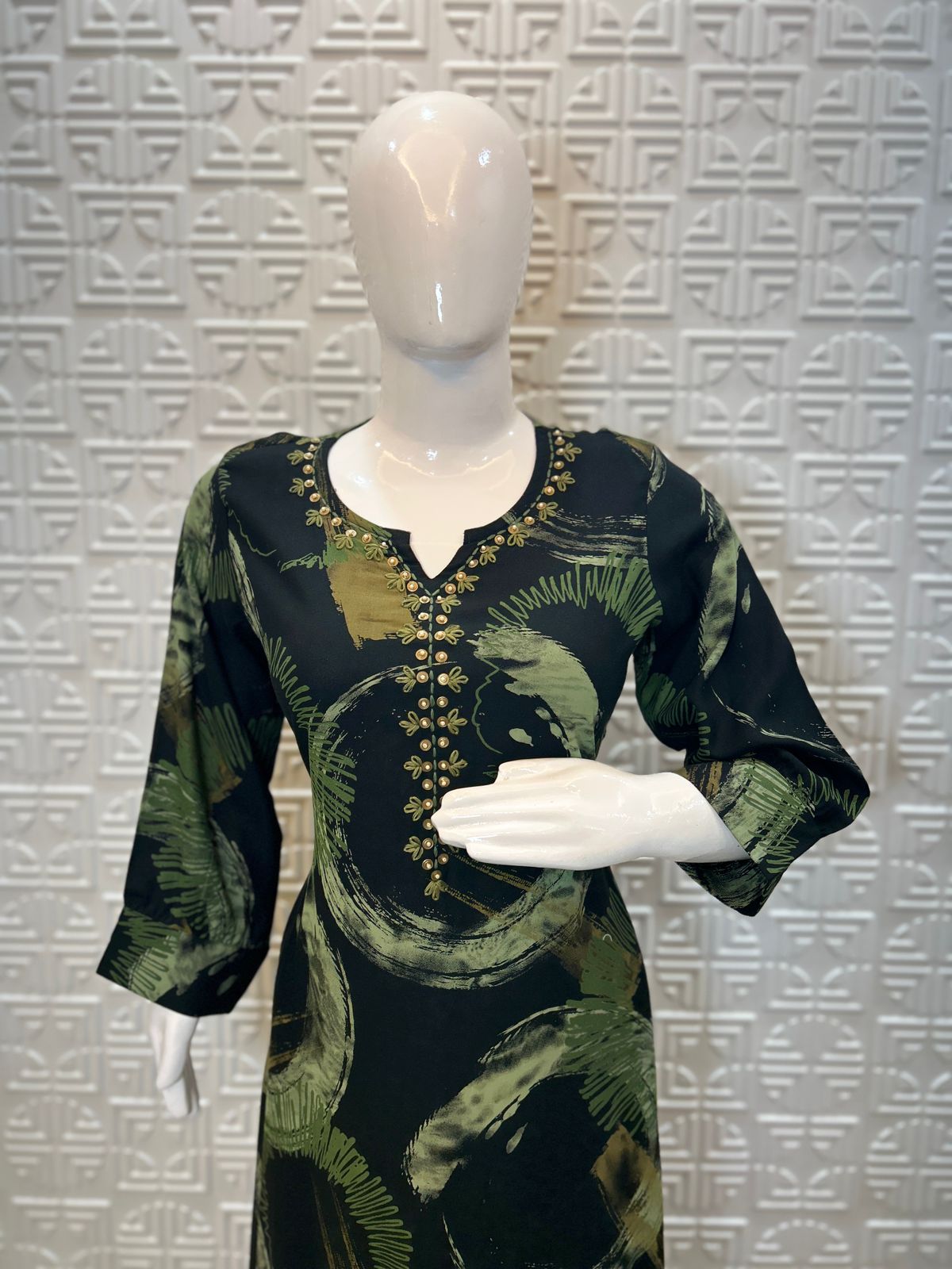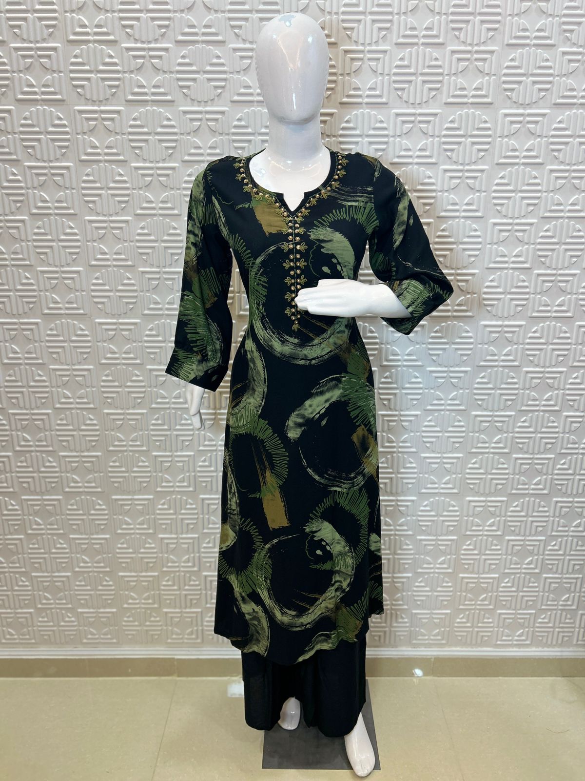 🖤 Base black with olive green print on kurta