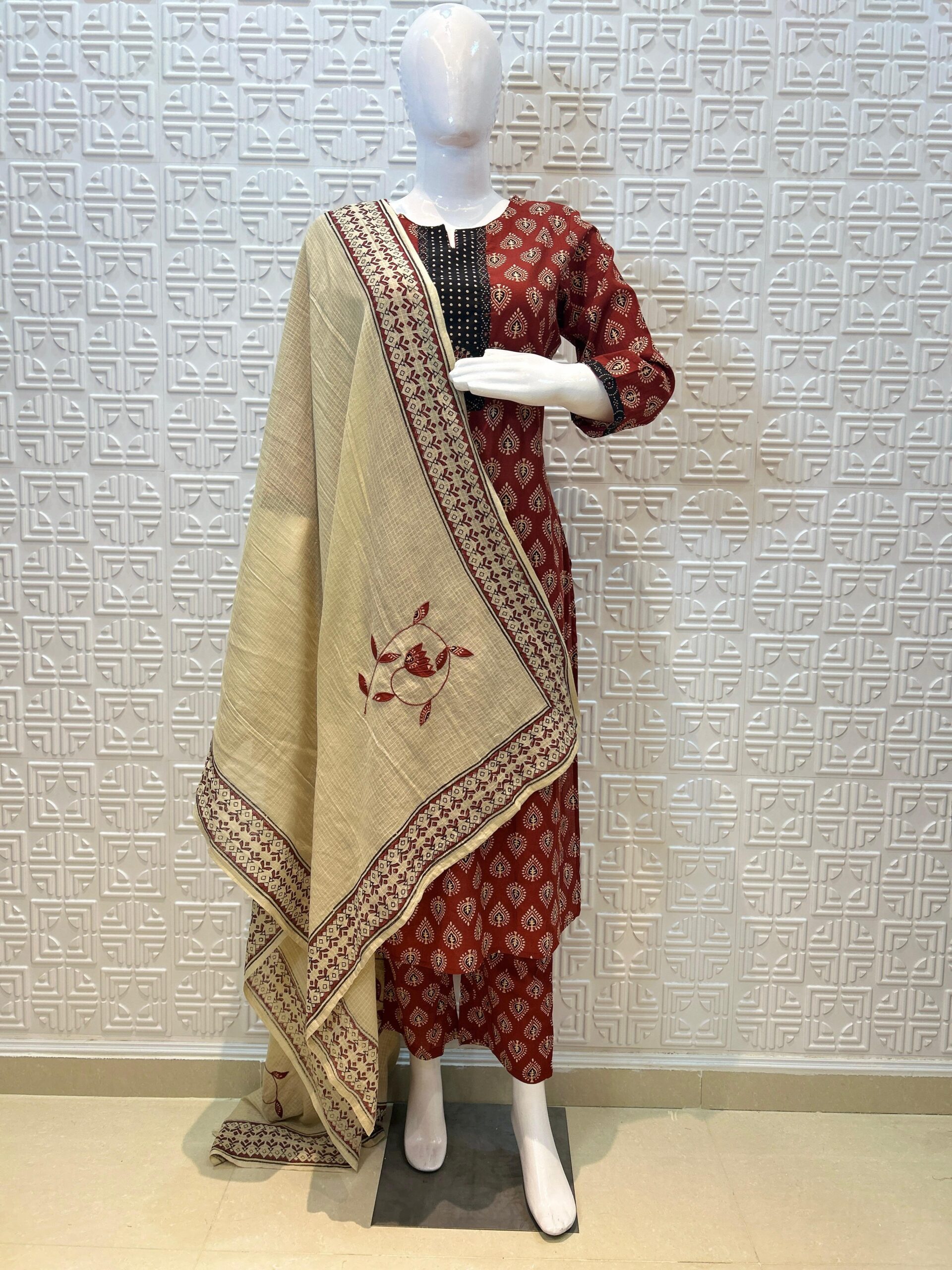 🔴 Colour – rich red color with a subtle print, possibly a traditional motif like paisleys or droplets.
