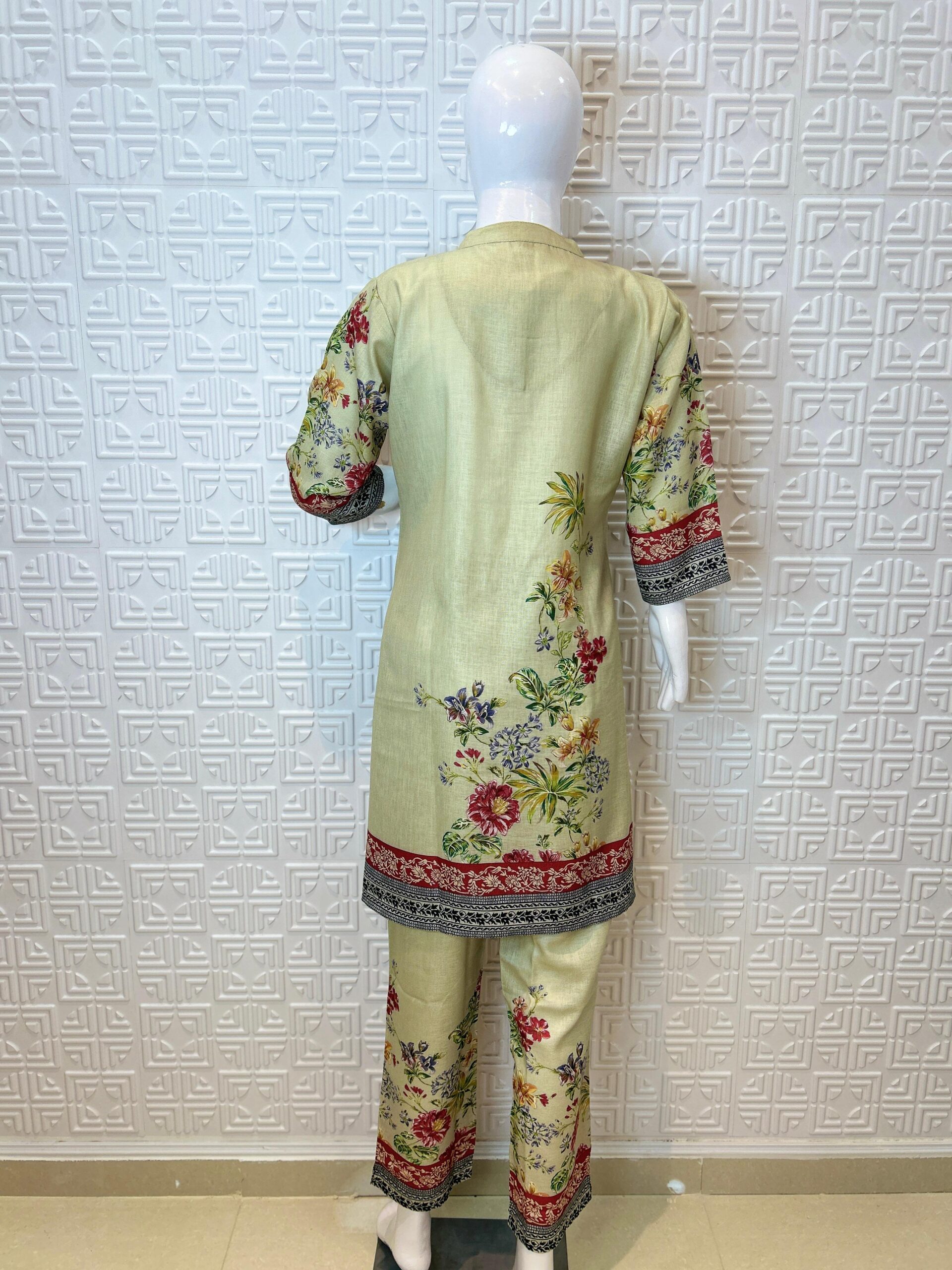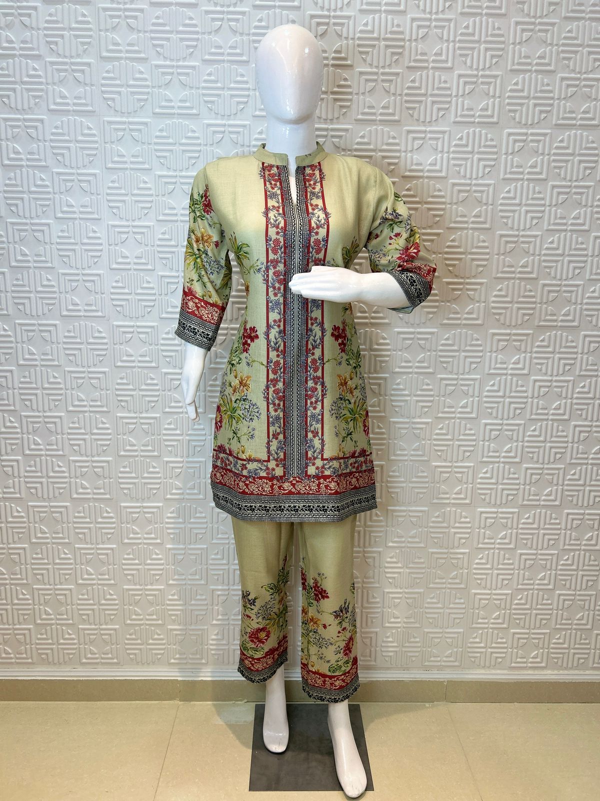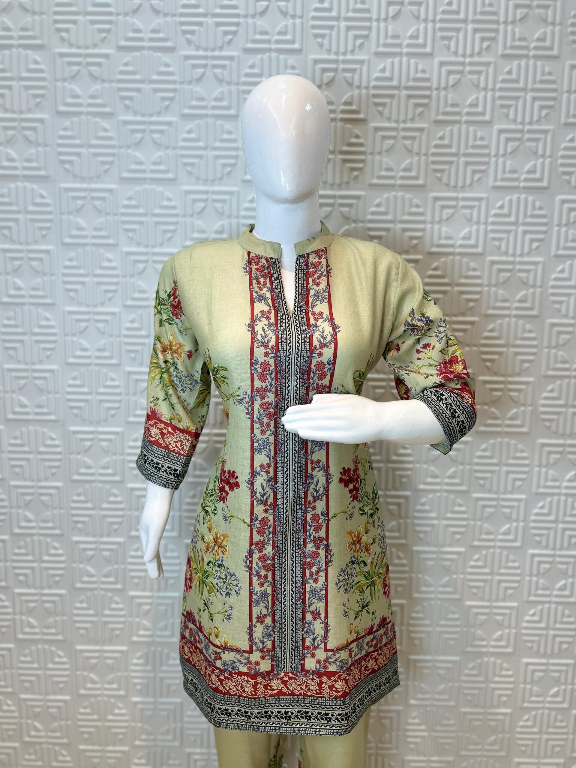 💚Trousers (Salwar/Pants): The trousers are straight-cut and match the base color of the tunic, with a continuation of the floral print and a patterned border at the ankle