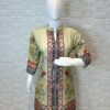 💚 Tunic (Kameez): It features a straight cut with a band collar and a central panel design running down the front, incorporating intricate patterns and colors like red, black, and white. The sleeves are three-quarter length and have matching patterned borders at the cuffs. The hemline of the tunic also has a detailed border design.