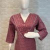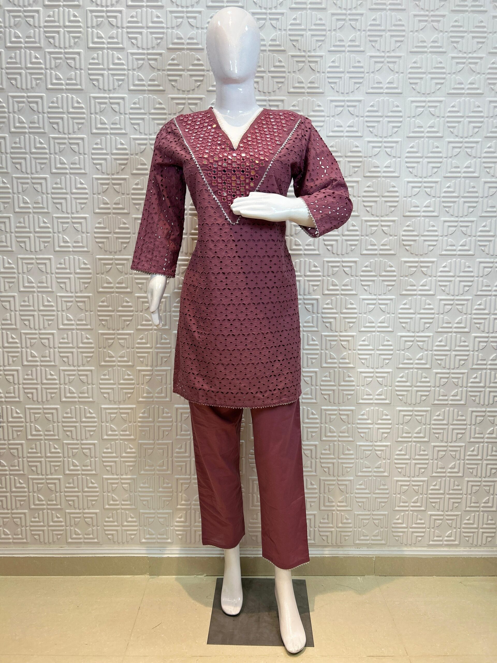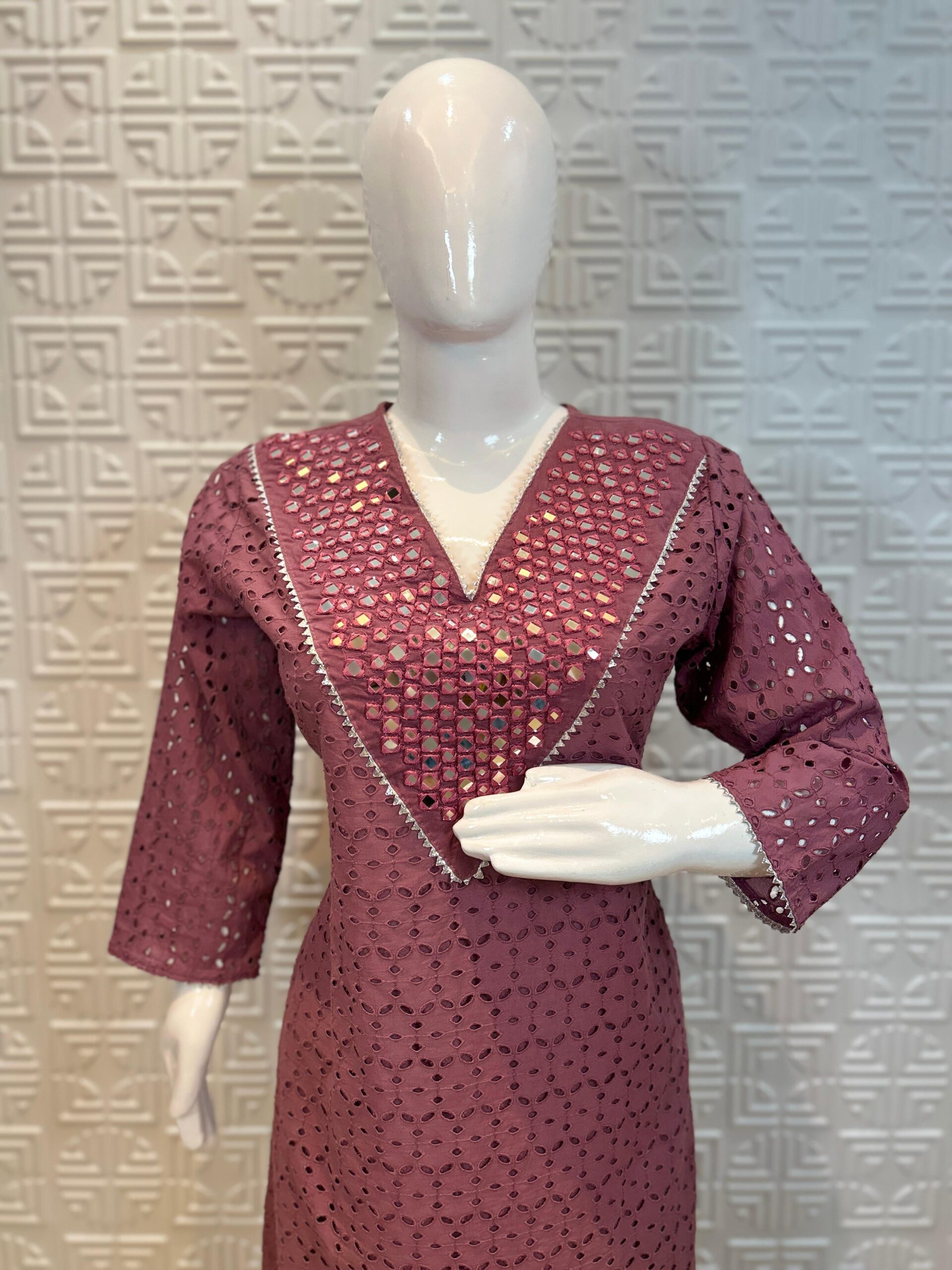 ❣️Kurta – The top features intricate cutwork embroidery, commonly known as Chikankari, throughout the fabric. There are also mirror work or embellishments around the neckline and chest area, adding a decorative element.