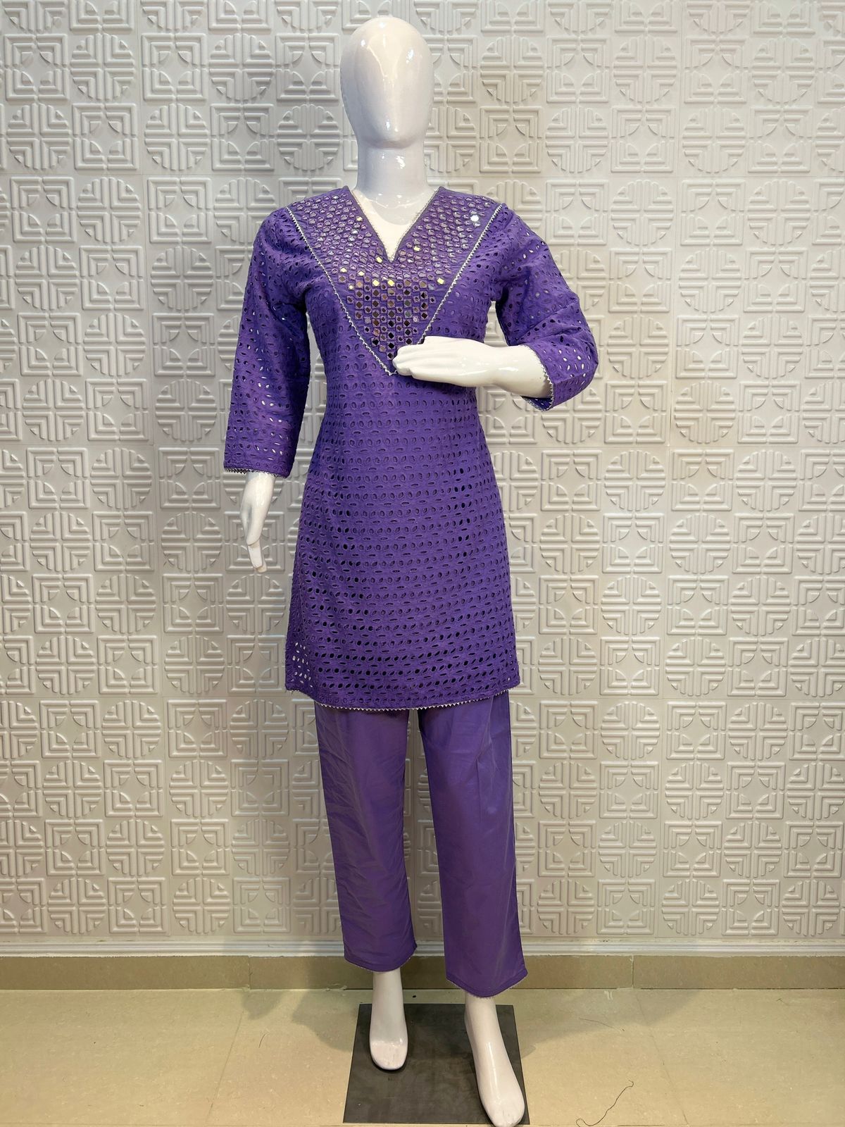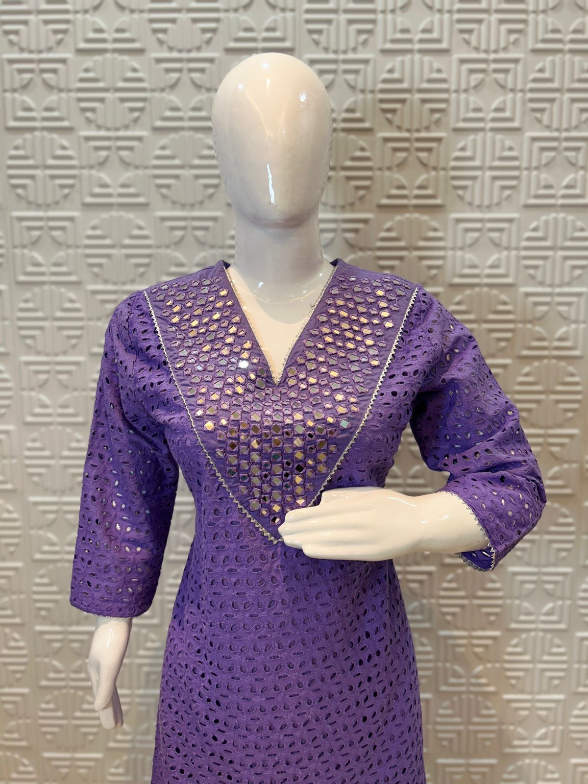 💜 Kurta – The top features intricate cutwork embroidery, commonly known as Chikankari, throughout the fabric. There are also mirror work or embellishments around the neckline and chest area, adding a decorative element.